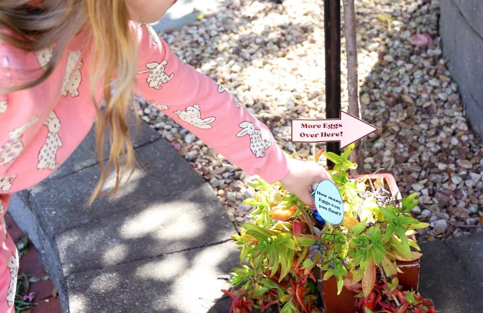 On the morning of Easter before the kids wake up, Tegan transforms her backyard into an Easter egg hunt suitable for kids of all ages. A few simple decorations instantly set the tone, with signs guiding the way, bunny footprints leading to hidden treasures and baskets ready for collecting eggs.